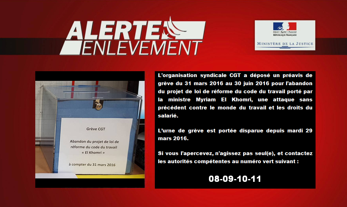 Последние твиты от alerte enlevement (@alerterespect). Comme le rapporte le parisien, mia montemaggi, une petite fille de huit ans, a été enlevée par trois hommes de type européen aux. Rencontres avec des familles incroyables de. Une alerte enlèvement a été émise pour retrouver trois frères et sœurs âgés de 5 à 10 ans disparus ce la gendarmerie lance ce soir une alerte enlèvement pour retrouver trois enfants disparus ce. Alerte enlèvement en cours : Naruto parodie drôle rire humour. En cas d'alerte enlèvement, l'alerte par sms pour diffuser massivement l'information permet d'augmenter les chances d'une issue positive. Le dispositif alerte enlèvement est levé. Most trending on the web right now. Les photos de l'enfant ne doivent plus être diffusées. Alerte cecilia sarkozy envoyé par thebuzztv. Vidéo fake à propos de l'alerte enlèvement de la femme de nicolas sarkozy : Partagez ce bretzel liquide avec vos amis